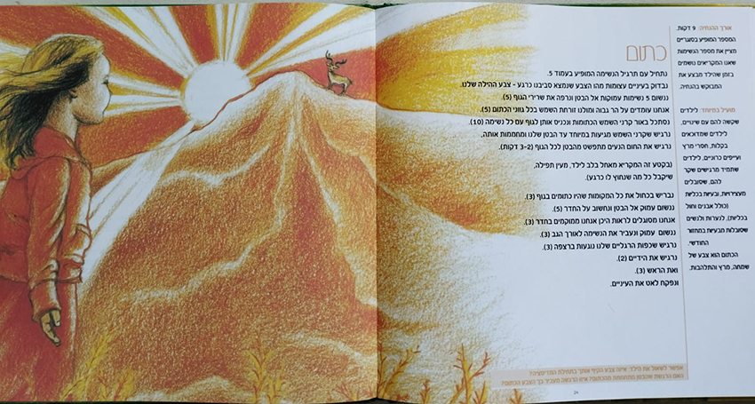 המדיטציות המומלצות מתוך הספר כתרגול התחלתי ולילדים קטנים היא “אהבה” שבעמוד 18, כתום שבעמוד 24, ירוק שבעמוד 28, וכן תכלת, כחול וסגול.