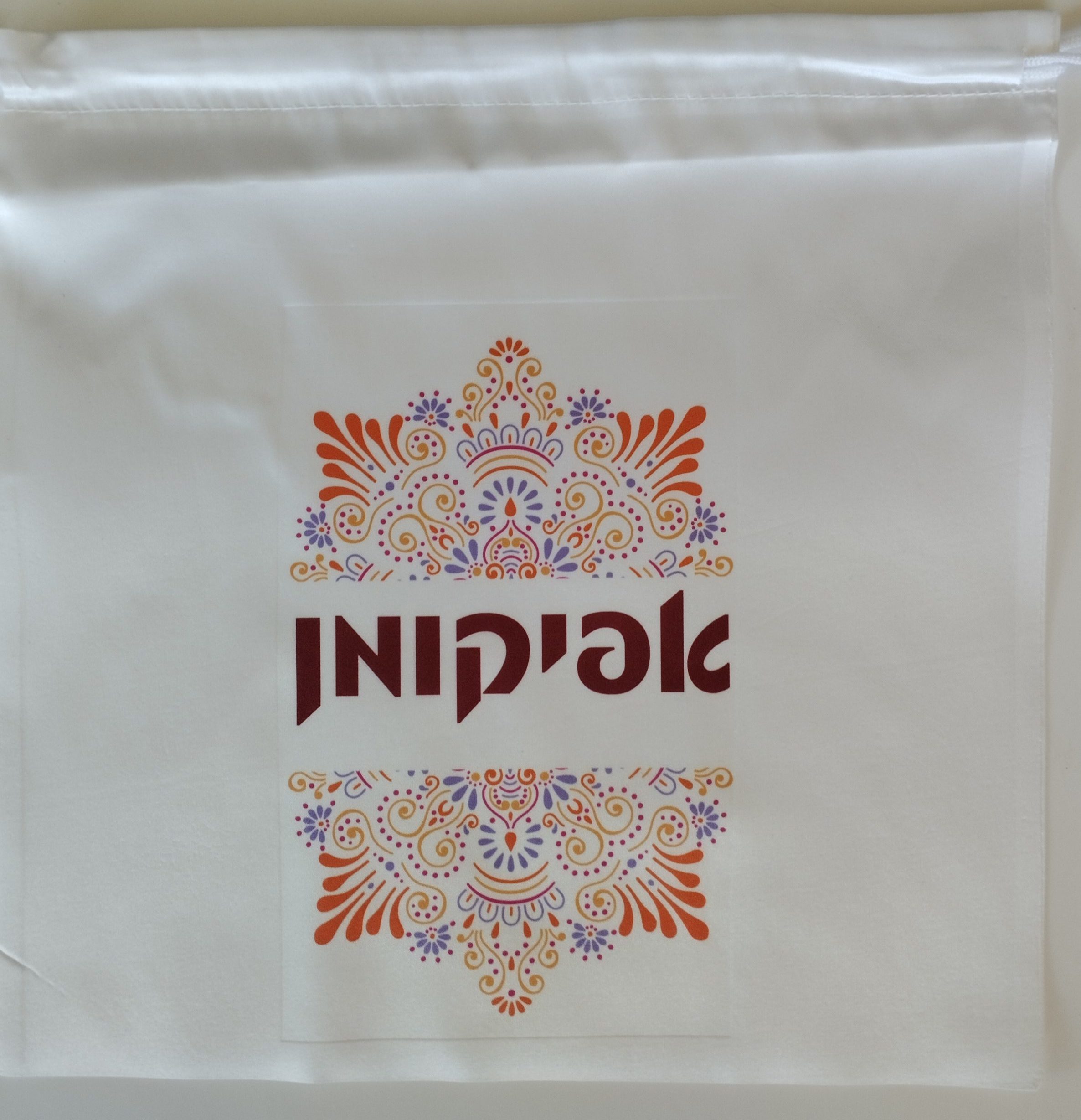 שקית אפיקומן מרשימה מסאטן לבן עם מיתוג והדפסה לבחירה ממבחר העיצובים,
