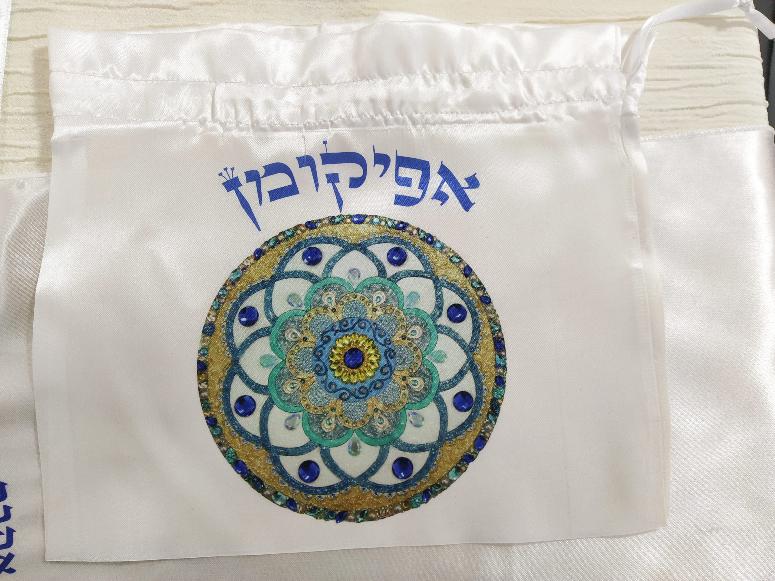 שקית אפיקומן מרשימה מסאטן לבן עם מיתוג והדפסה לבחירה ממבחר העיצובים,