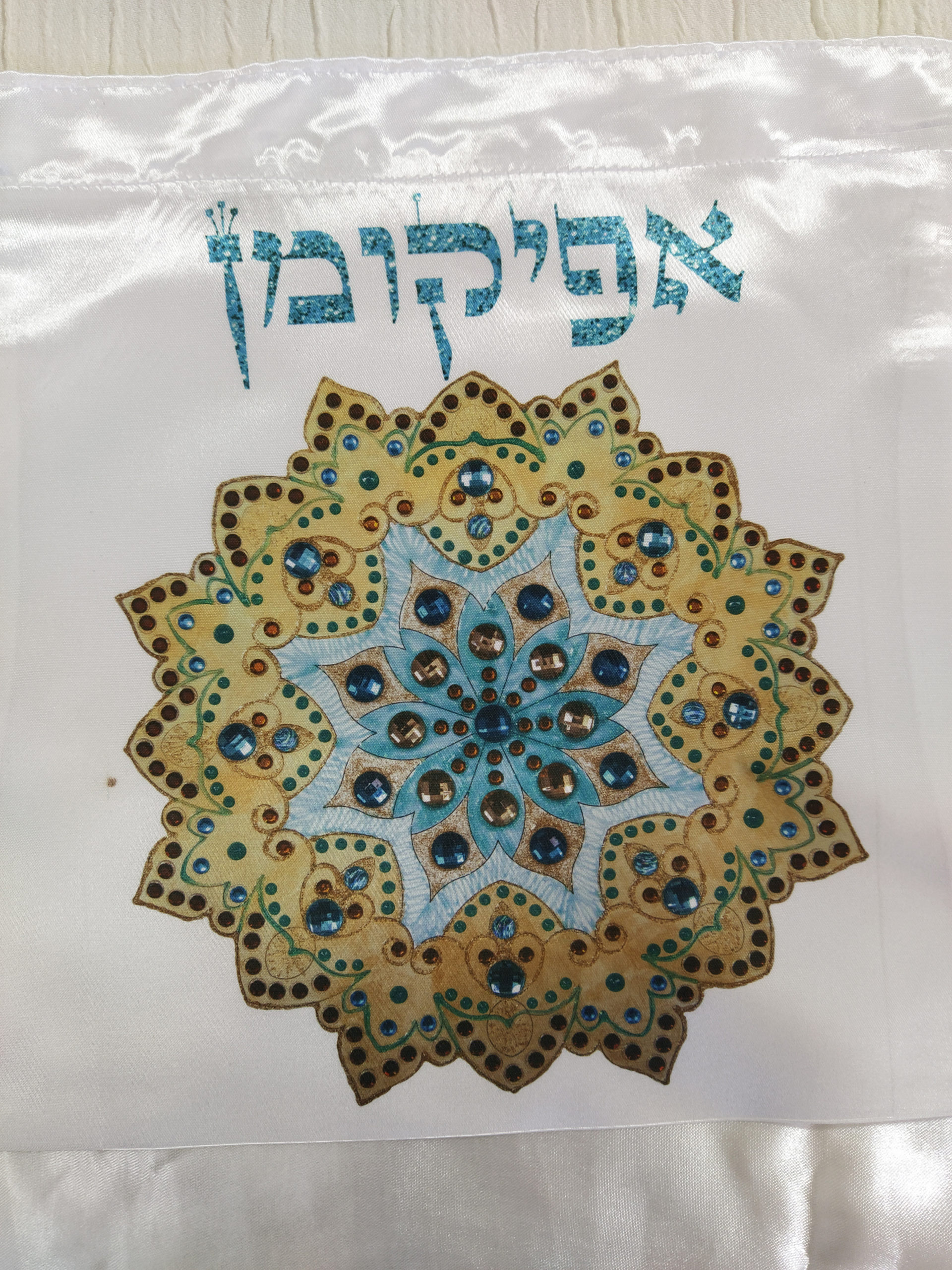 שקית אפיקומן מרשימה מסאטן לבן עם מיתוג והדפסה לבחירה ממבחר העיצובים,