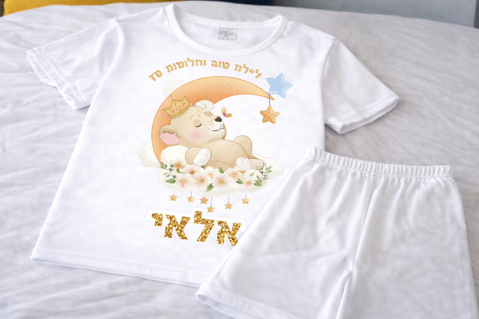 פיג'מה (מכנס קצר וחולצה קצרה) רכה ואיכותית מודפסת עם שם הילד/ילדה