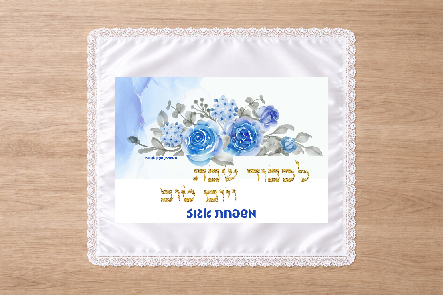 כיסוי חלה גדול ומהודר מסאטן לבן עם שול תחרה לבן עם שם המשפחה של הילד/ה