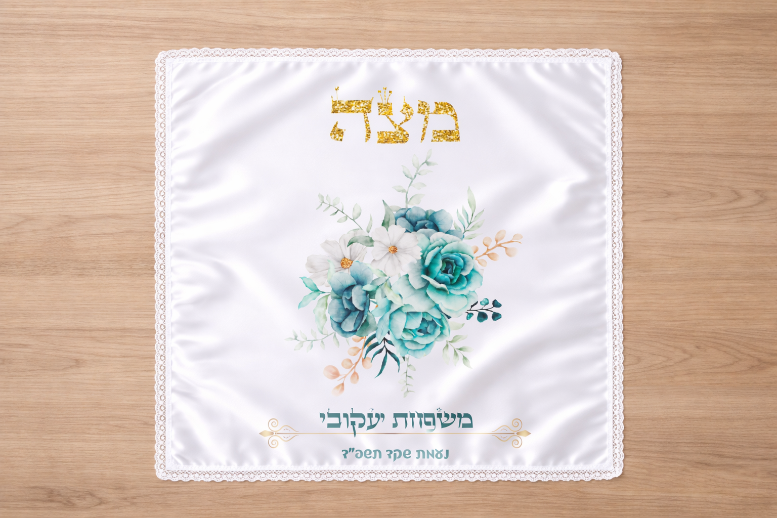 כיסוי חלה גדול ומהודר מסאטן לבן עם שול תחרה לבן עם שם המשפחה של הילד/ה
