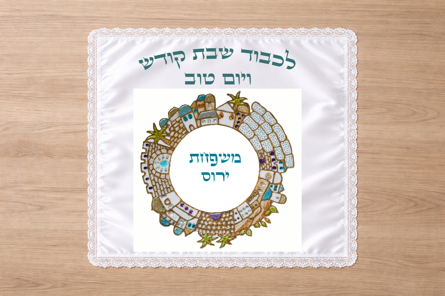 כיסוי חלה גדול ומהודר מסאטן לבן עם שול תחרה לבן