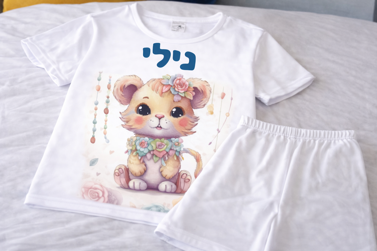 פיג'מה (מכנס קצר וחולצה קצרה) רכה ואיכותית מודפסת עם שם הילד/ילדה