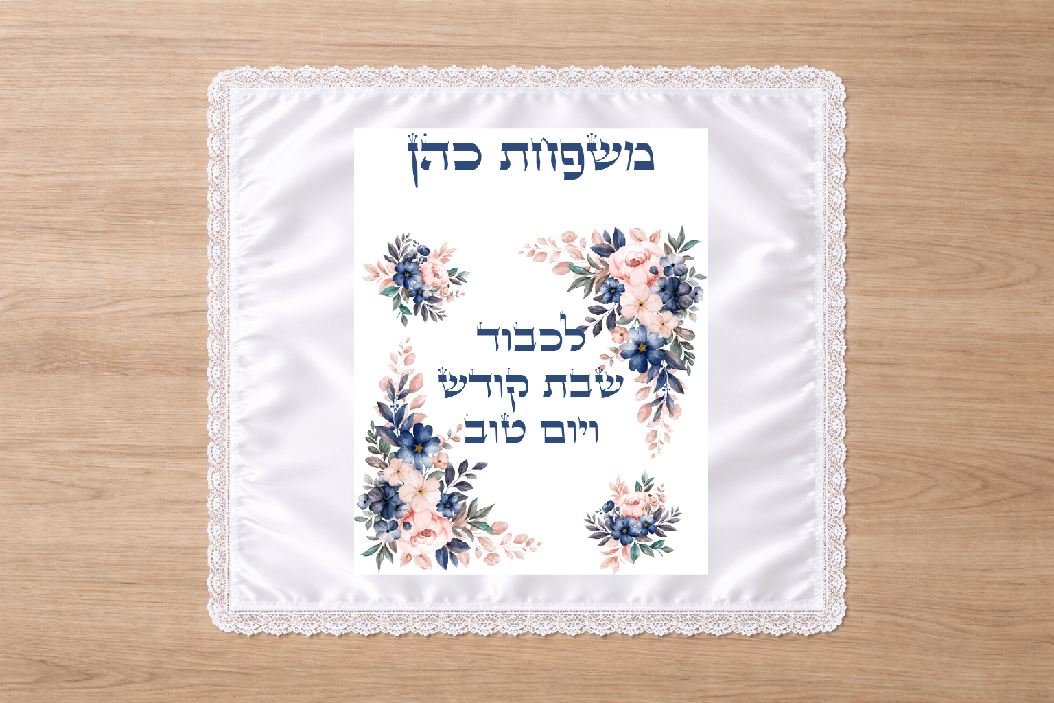 כיסוי חלה גדול ומהודר מסאטן לבן עם שול תחרה לבן עם שם המשפחה של הילד/ה