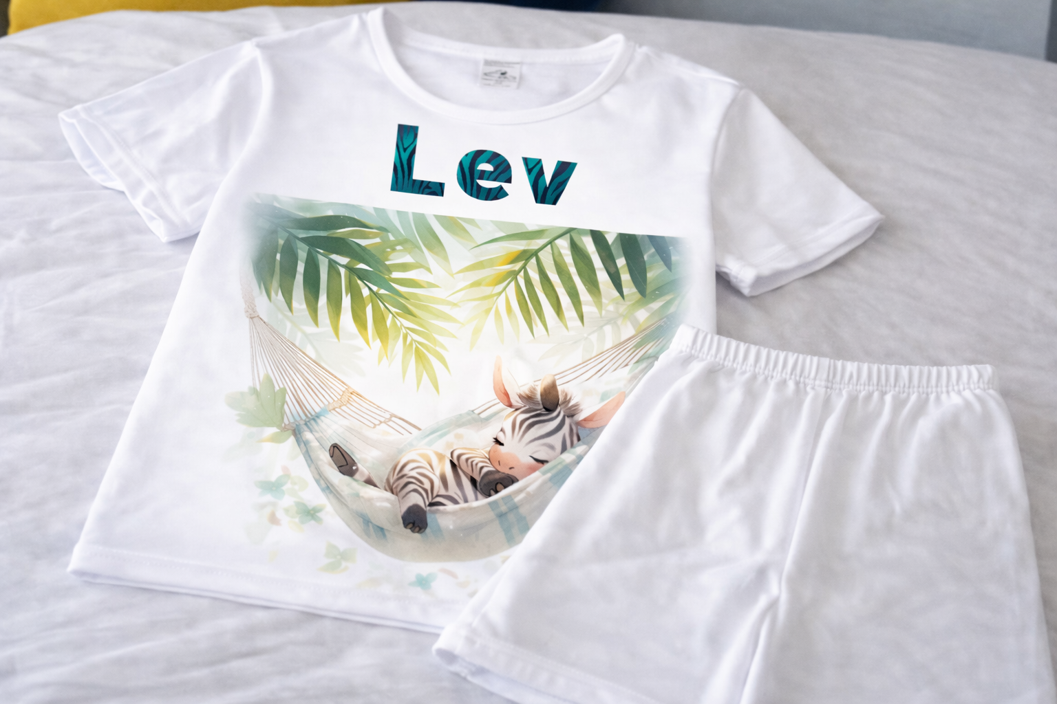 פיג'מה (מכנס קצר וחולצה קצרה) רכה ואיכותית מודפסת עם שם הילד/ילדה