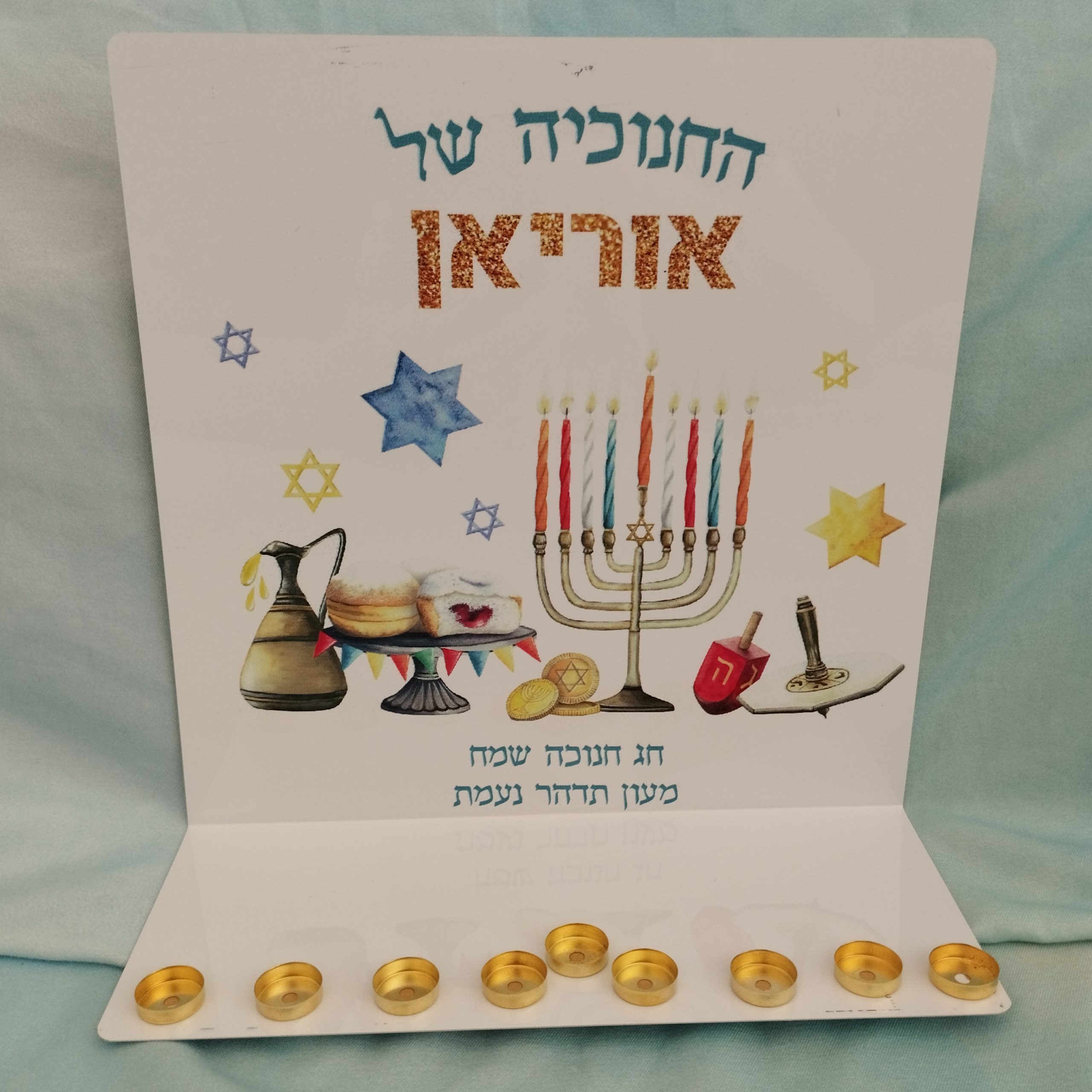 חנוכייה בגודל איי4 מודפסת על אלומיניום עם פינות מעוגלות עם שם הילד/ה והגן + קנים מודבקים ואריזת מתנה בצלופן עם סרט מתנה.