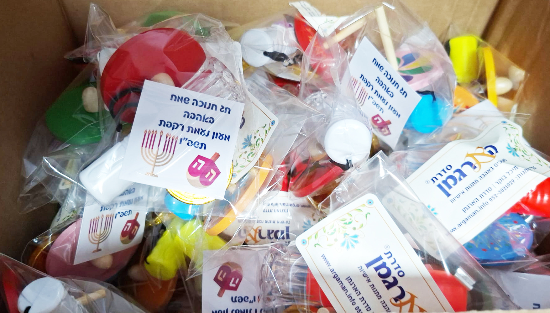 בשקית צלופן חמודה כל ילד יקבל סביבון עץ צבעוני או סביבון אורות לד קטן + פנס לד (אנחנו בודקים שכל פנס עובד)+ מטבע שוקולד וכרטיס ברכה מהגן