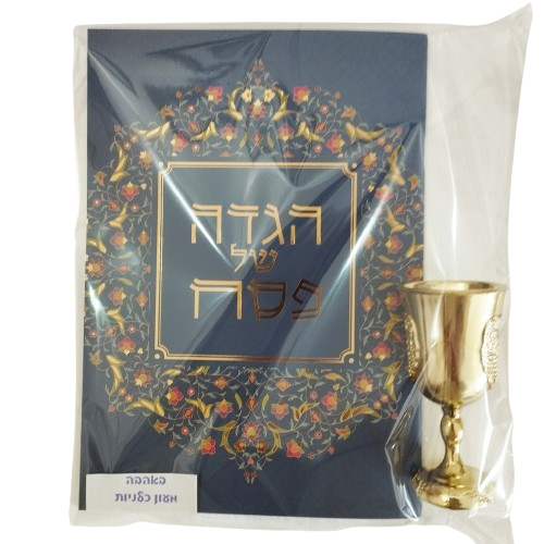 מארז מתנה הכולל כוס קידוש לילדים + הגדה יוקרתית משפחתית עם עיטורי זהב
