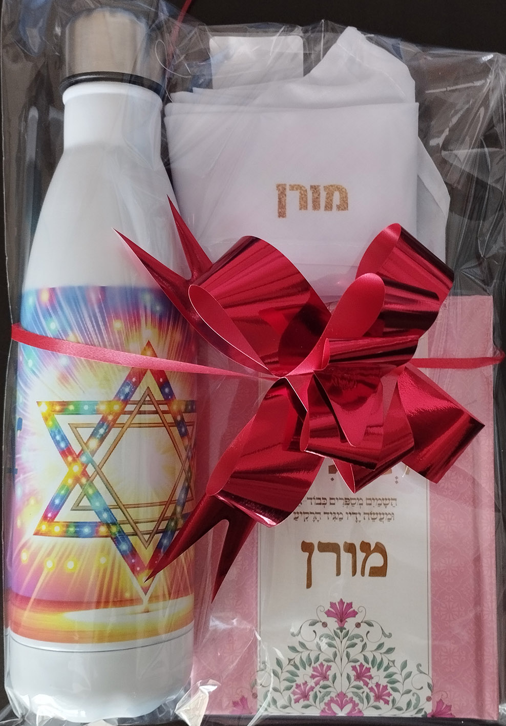 אנחנו אורזים הכל מתנה בשקית צלופן עם סרט מתנה גדול (ראו התמונות של המוצר), ומגישים לפי חלוקה לכיתות.