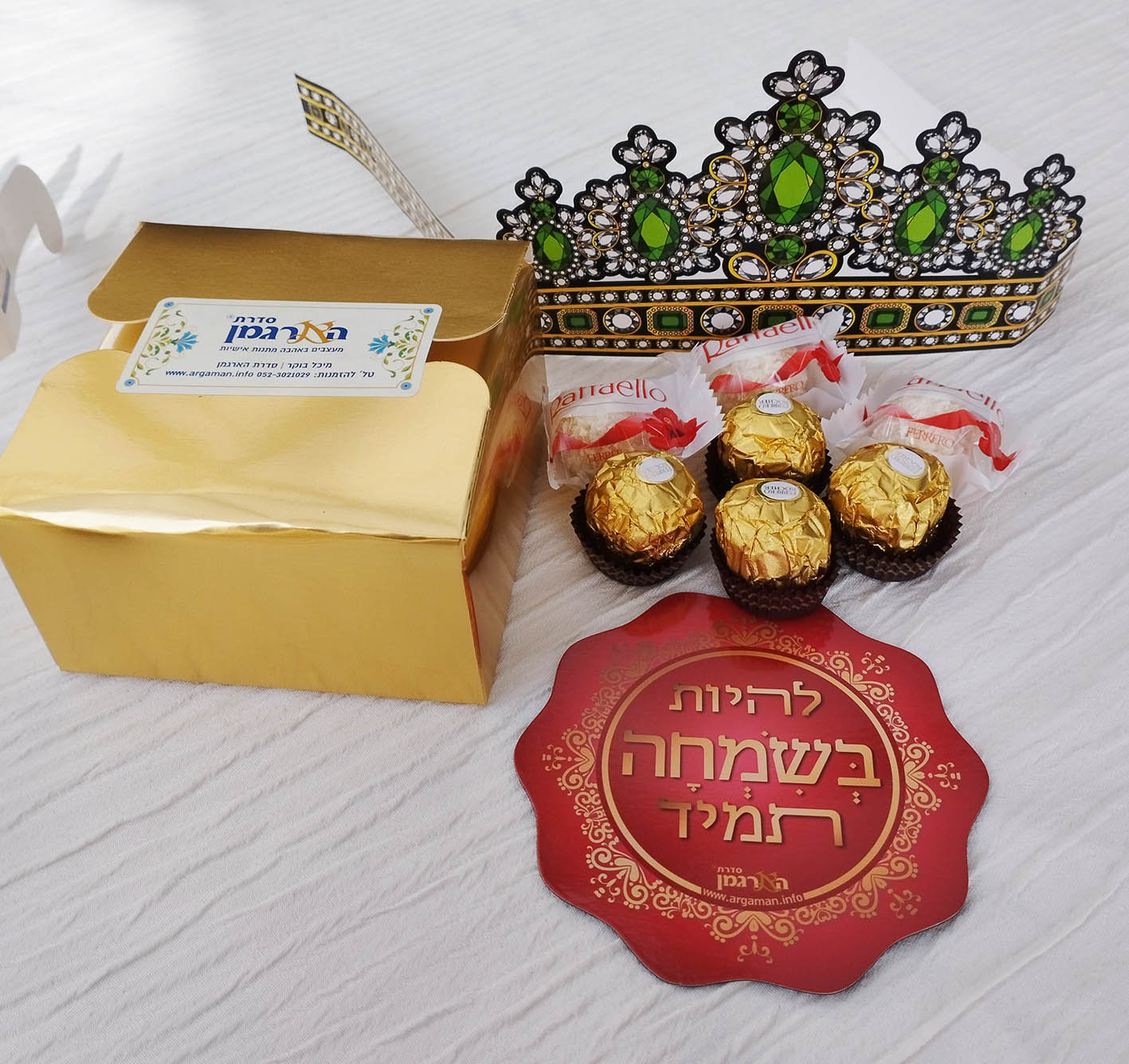 4 פרר רושה + 3 רפאלו + כתר מרשים מתכוונן למידת הראש + מגנט 12 סמ קוטר 'להיות בשמחה תמיד'