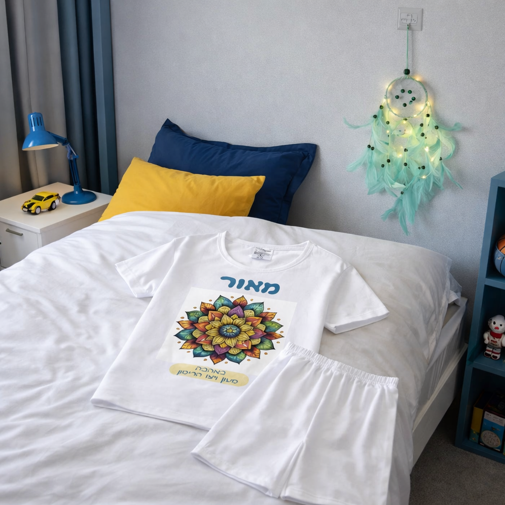 פיג'מה (מכנס קצר וחולצה קצרה) רכה ואיכותית מודפסת עם שם הילד/ילדה + תאורת אוירה לד