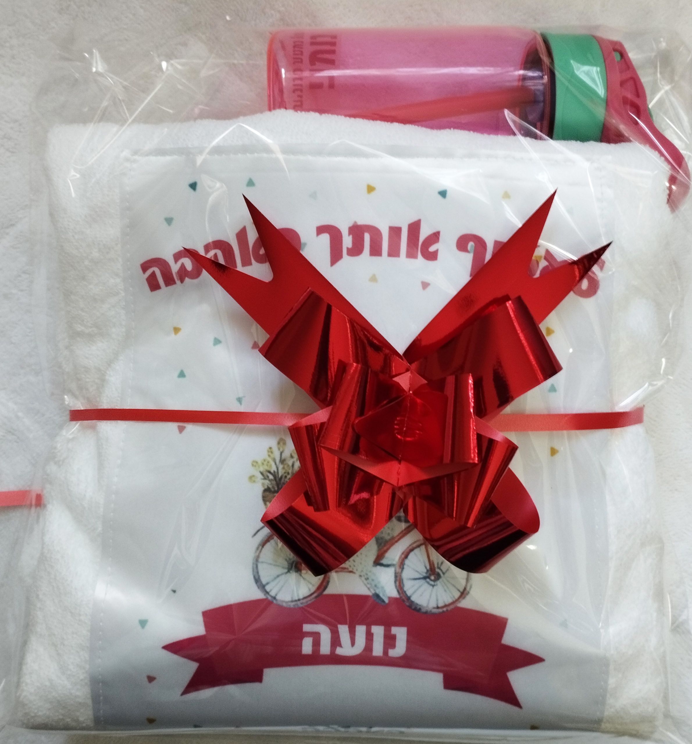 גודל המגבת 120X60סמ+ קפוצ'ון. הבקבוק עם שם הילד במדבקה שקופה עמידה בנוזלים