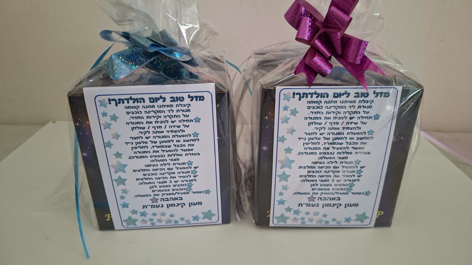 אנחנו אורזים את קופסת המנורה בצלופן עם סרט ומוסיפים כרטיס ברכה מטעם הגן/המעון במארז.