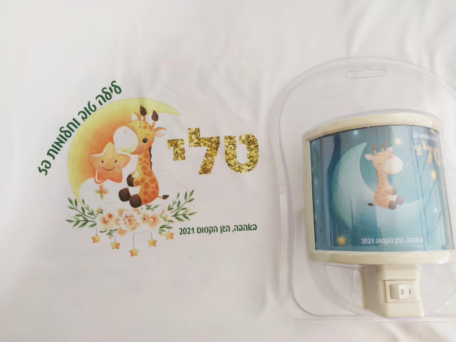 המארז כולל ציפית לכרית בגודל 50 על 70 סמ עם הדפסת שם הילד/ה, הדפסה על הכרית בגודל 4A, ומנורת לילה תואמת עם שם הילד/ה עם נורה מורכבת, מוכנה להפעלה.