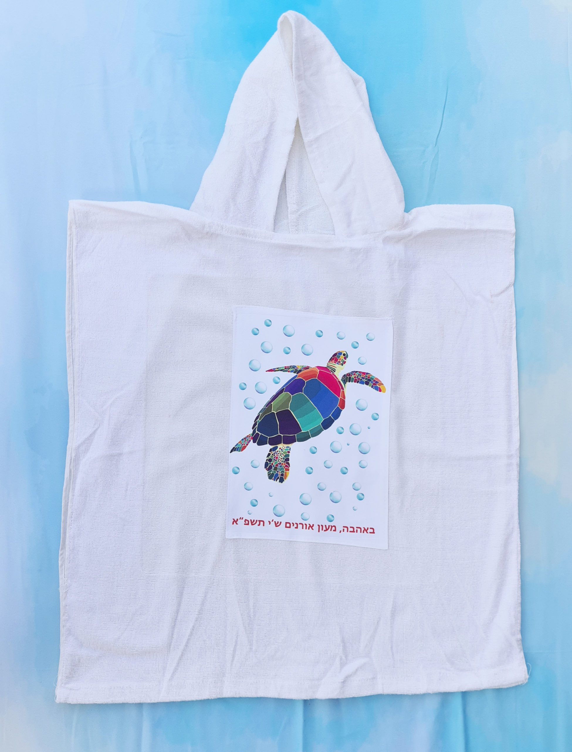 מגבת פונצ'ו 100% כותנה עם קפוצ'ון, שטח ההדפסה מעוטר ברקמה לבנה.