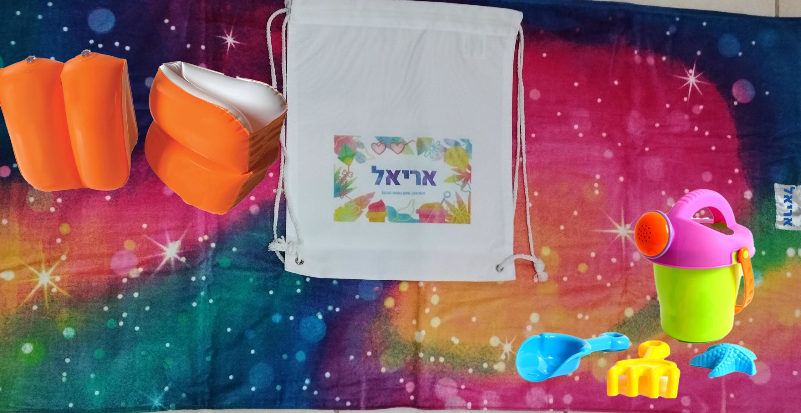סט מגבת רחצה 100% כותנה דגם גלקסיה עם שם הגן + תיק שרוכים מודפס עם שם הילד + דלי משפך עם משחקים לים + זוג מצופים תואם גיל