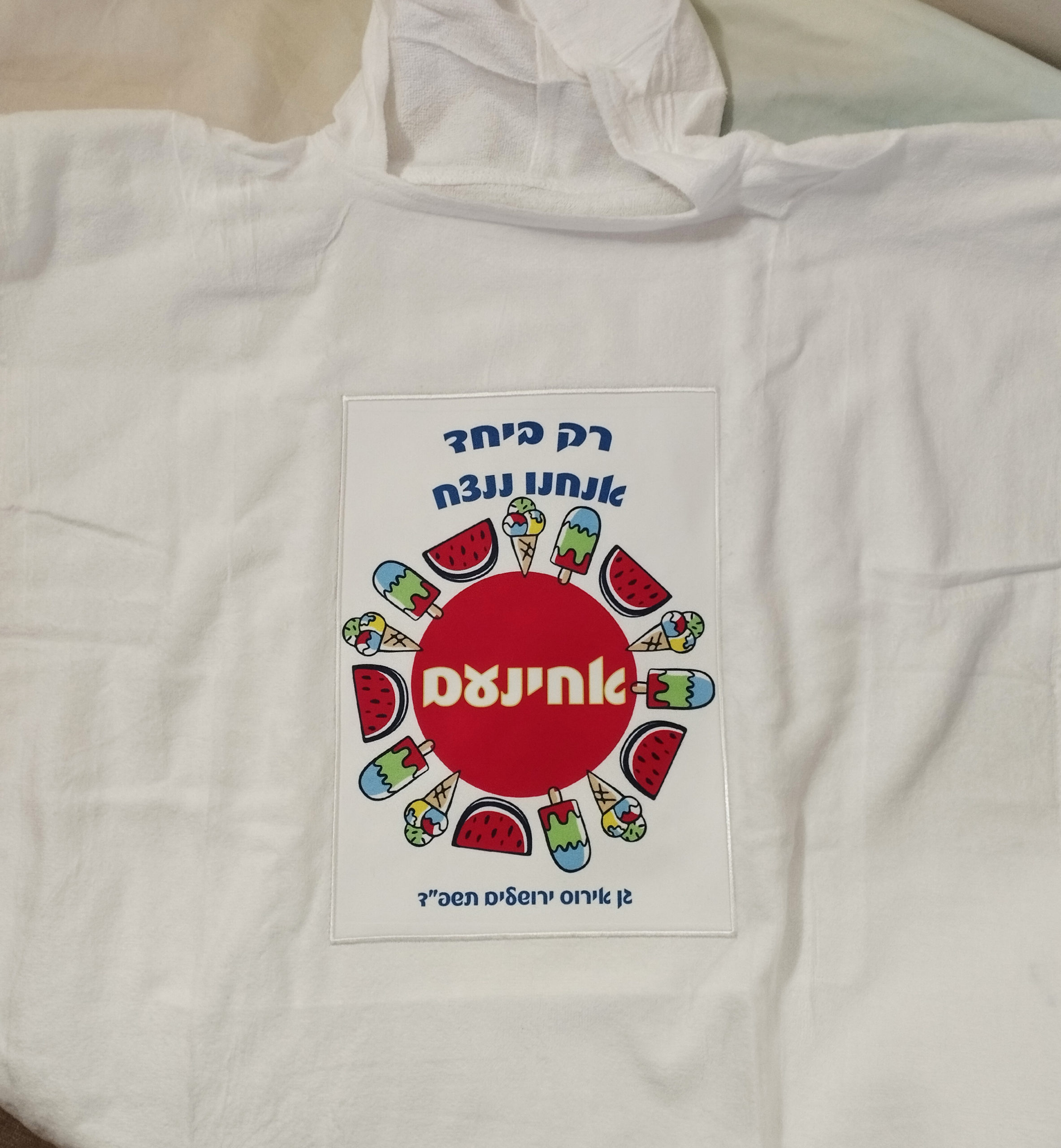 קפוצ'ון מגבת 100% כותנה עם הדפסה, שם הילד/ה והקדשה מהגן (הדפסה בגודל 4A)