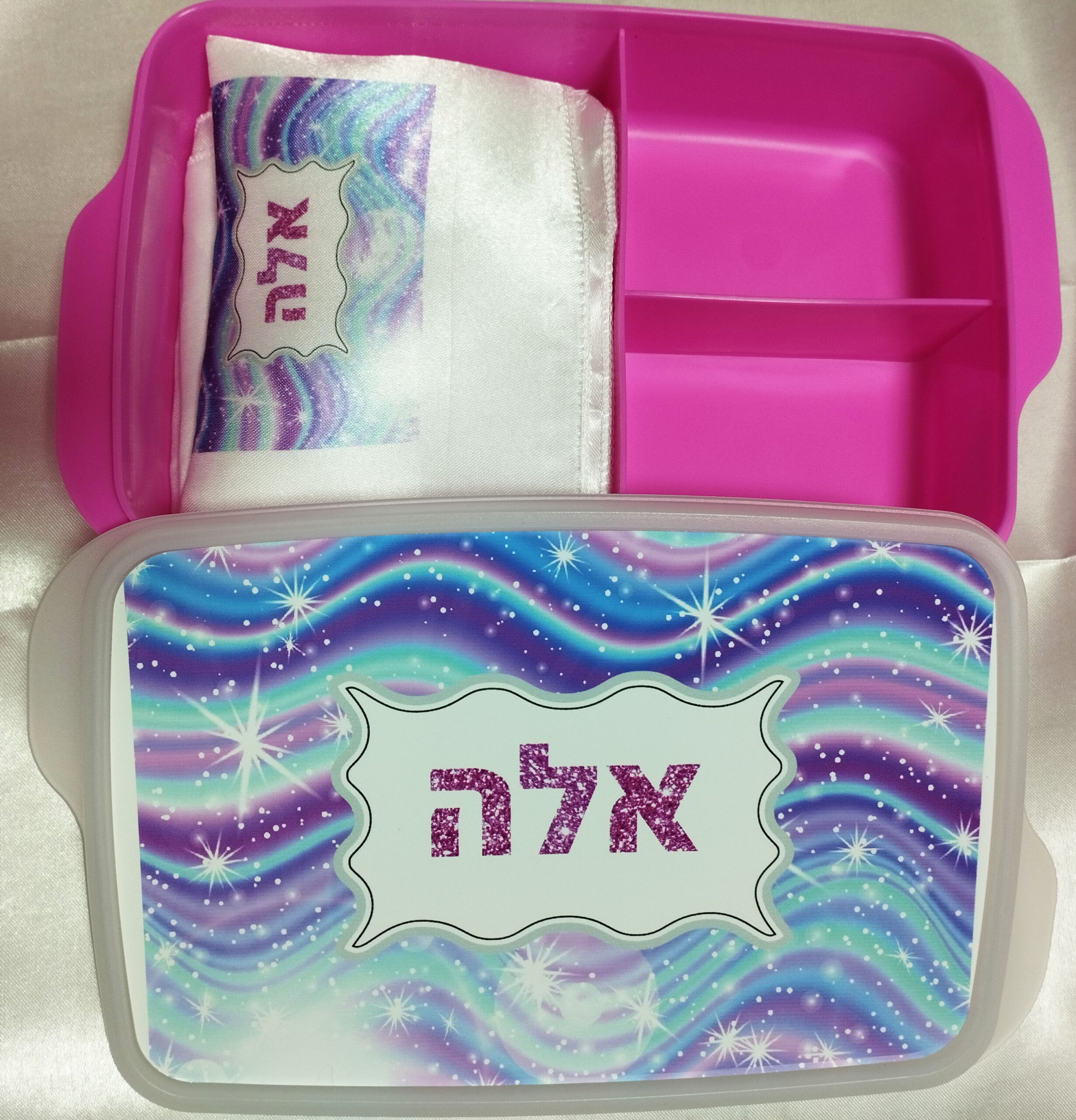 קופסת אוכל מחולקת איכותית עם הדפסה ושם הילד/ה, ניתן להתאים דפוס זהה על בקבוק נירוסטה