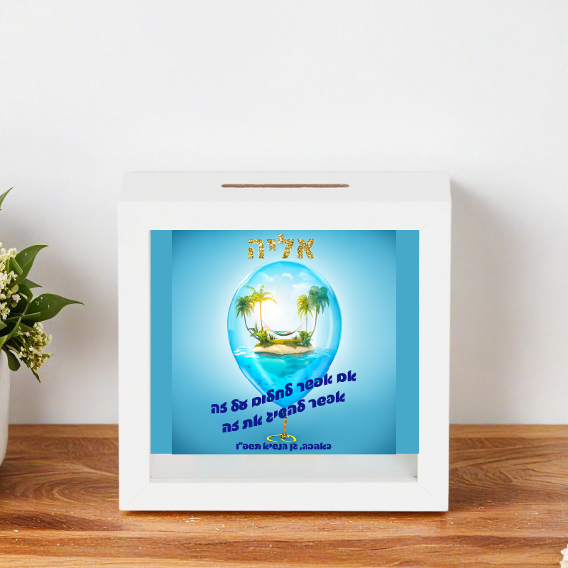 קופת חיסכון איכותית מעץ לבן עם חזית שקופה עם שם הילד/ה – בטיחותי – לא זכוכית!