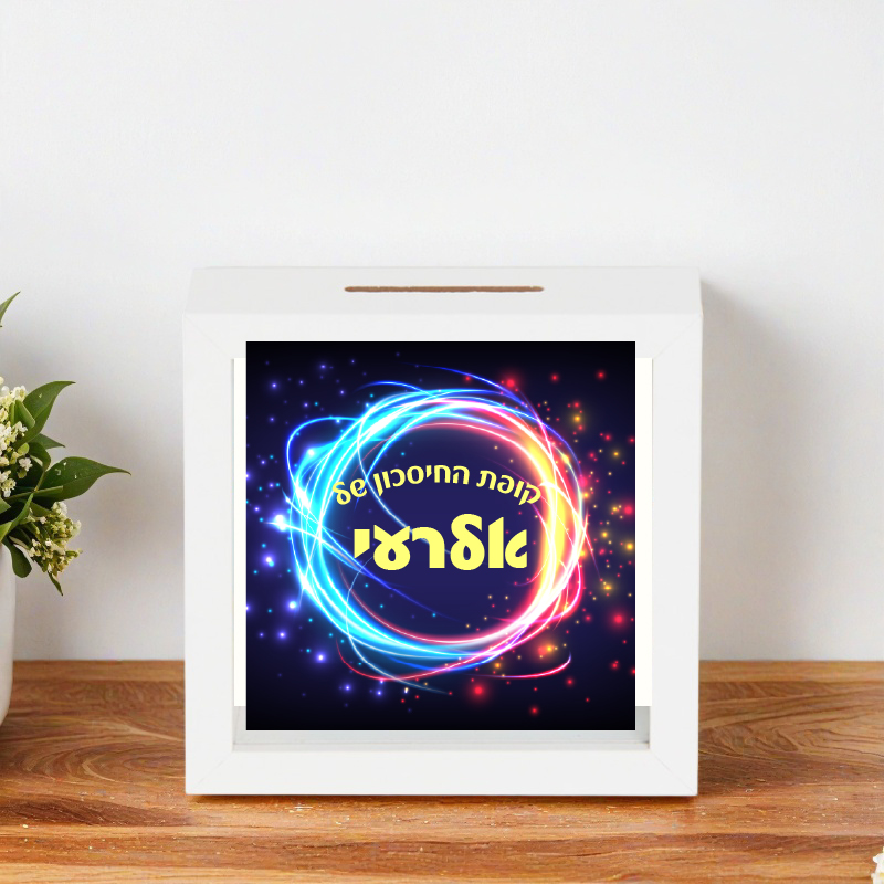 קופת חיסכון איכותית מעץ לבן עם חזית שקופה עם שם הילד/ה – בטיחותי – לא זכוכית!