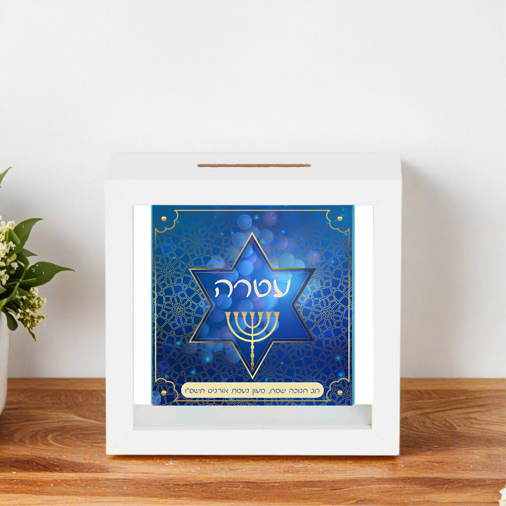 קופת חיסכון איכותית מעץ לבן עם חזית שקופה עם שם הילד/ה – בטיחותי – לא זכוכית!