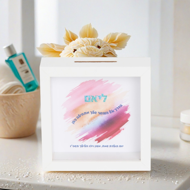 קופת חיסכון איכותית מעץ לבן עם חזית שקופה עם שם הילד/ה – בטיחותי – לא זכוכית!