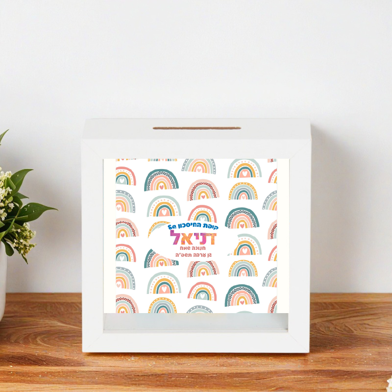 קופת חיסכון איכותית מעץ לבן עם חזית שקופה עם שם הילד/ה – בטיחותי – לא זכוכית!