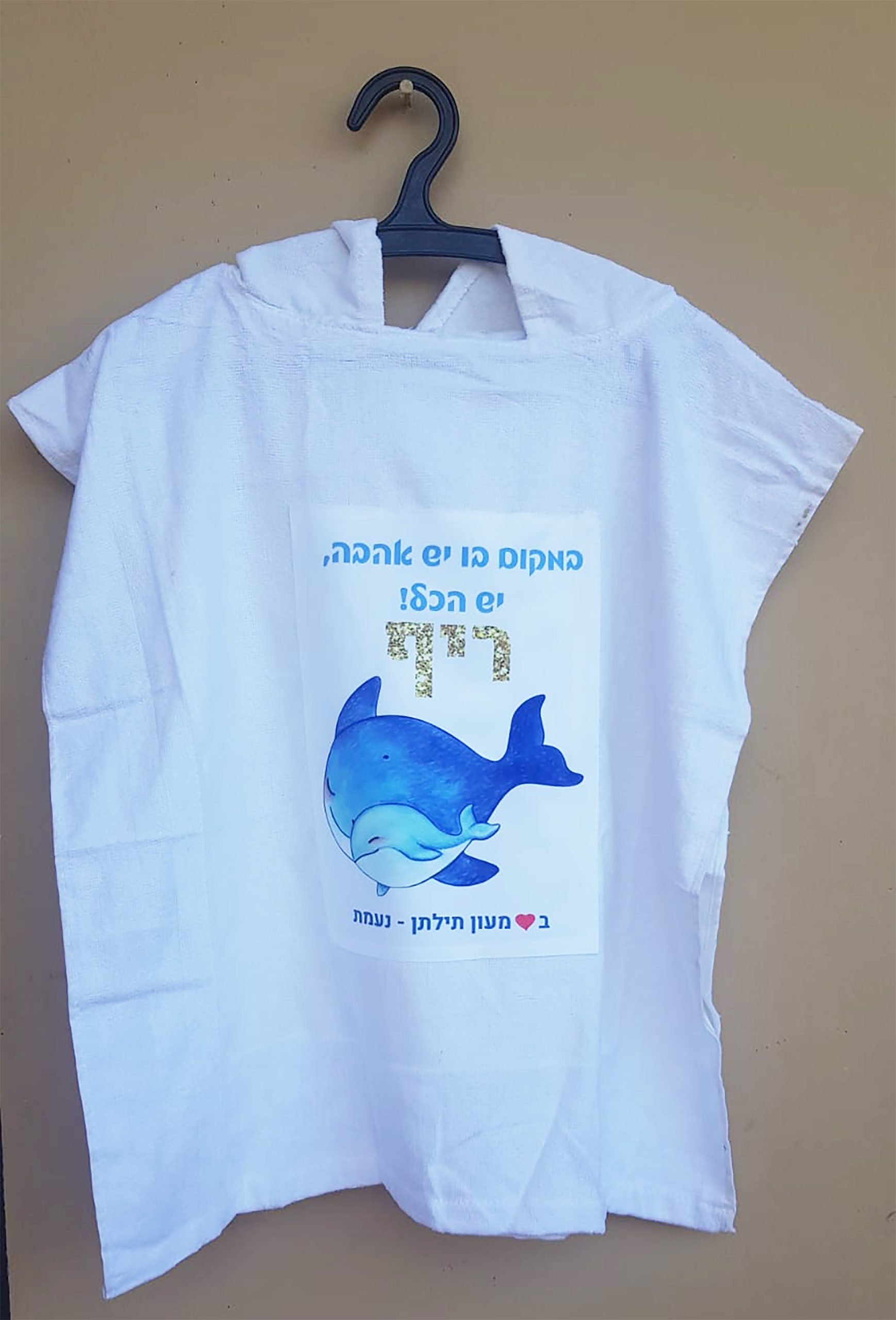 קפוצ'ון מגבת 100% כותנה עם הדפסה, שם הילד/ה והקדשה מהגן (הדפסה בגודל 4A)