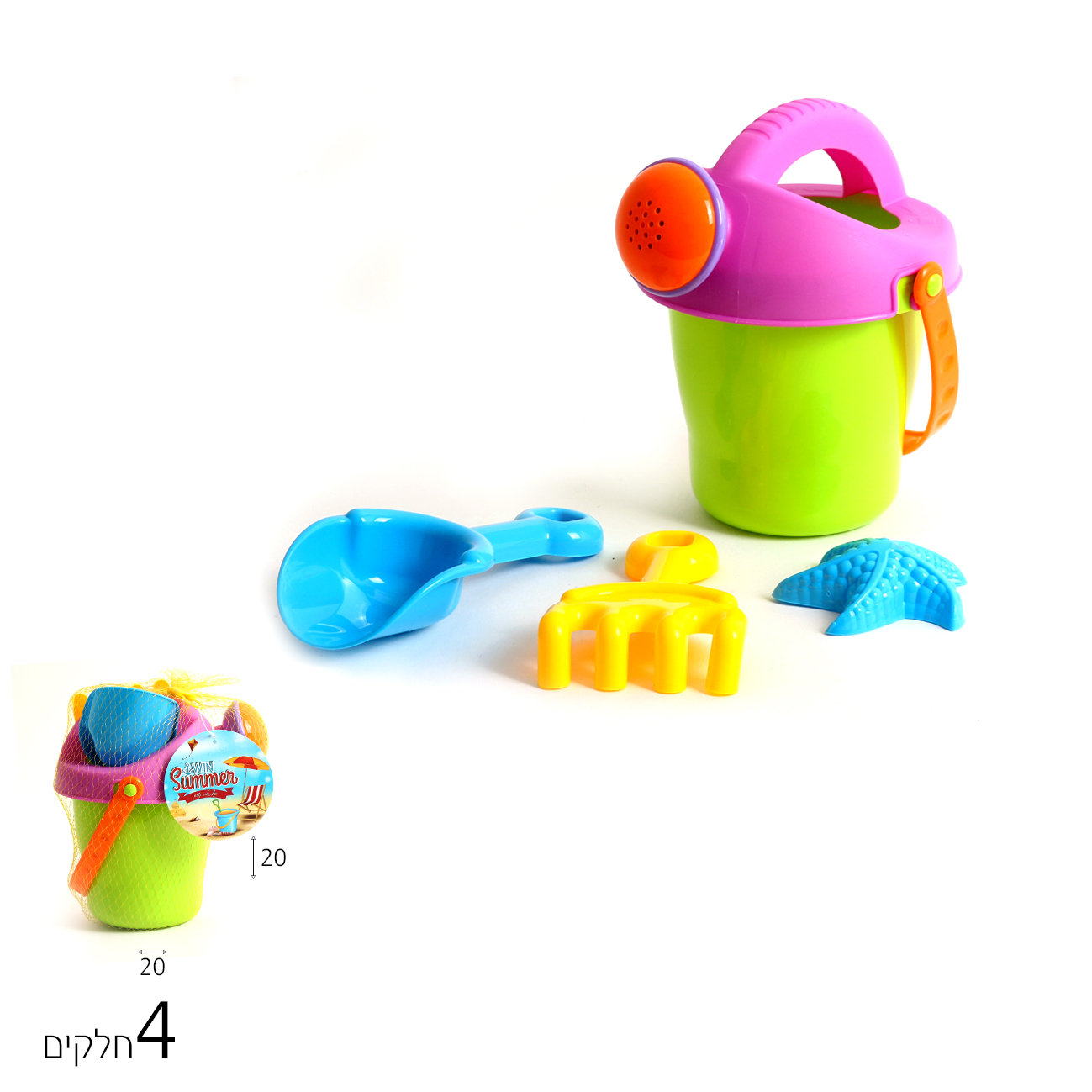 מארז איכותי וגדול של דלי לים שהוא גם משפך + 3 כלי משחק שונים